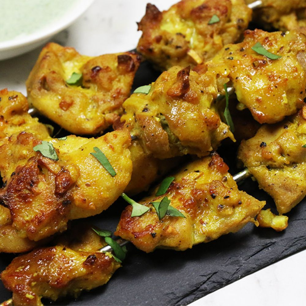 Succulent chicken kebabs marinated in mint, yogurt, and spices; a true crowd-pleaser.
